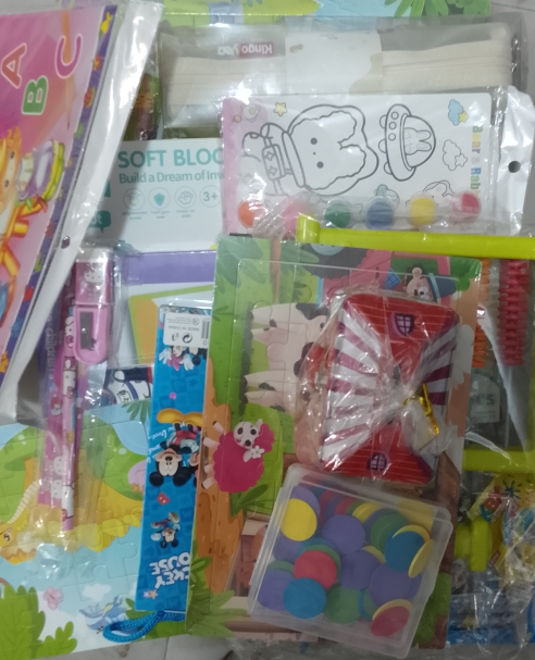 This is clearance sales extension 1 , and it comprises of a truck abacus ,wooden puzzle,mesh pouch , stationary in box , piggy bank ,soft building blocks, magnetic book etc and you will be getting it 50000